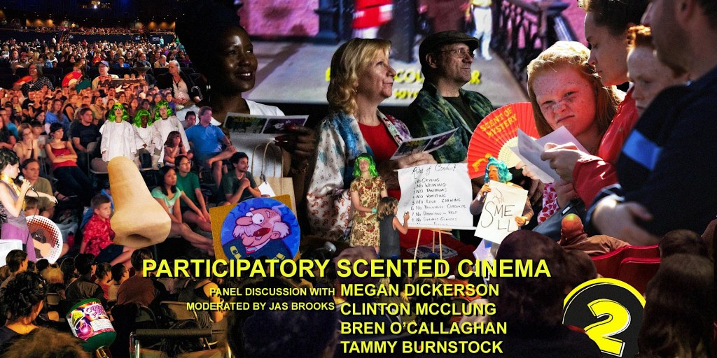 We were excited to welcome a panel of international artists who have tackled the world of scented cinema over the last two decades, presented a variety of scented experiences, and each with their own creative goals. Topics covered by the panel discussion spanned how play impacts cinema, how multisensory experiences lower the barrier of entry in cultural engagement, what the legal ramifications of such works are, and more. The panel was accompanied by an original scratch-and-sniff card featuring three scents representative of each panelists’ work (including Burnstock’s) for a total of 12 fragrances.