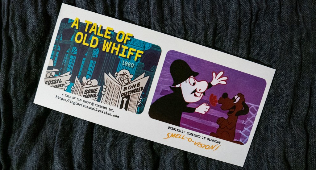 The cartoon accompanied Mike Todd Jr.’s Scent of Mystery in its original theatrical release in 1960. This first scented animation originally featured 15 unique odors, delivered to each seat by Swiss inventor Hans Laube’s “Smell Brain”. A long-lost print, only recently discovered, has been restored and re-mastered by David Strohmaier. Tammy Burnstock, Michelle French (FrenchBaker), Missy Whitaker (Print-A-Scent), and Neal Harris (Scentevents) collaborated to create a scratch and sniff card featuring 8 odors, including hot dog, dinosaur bone, and a complex field of flowers.