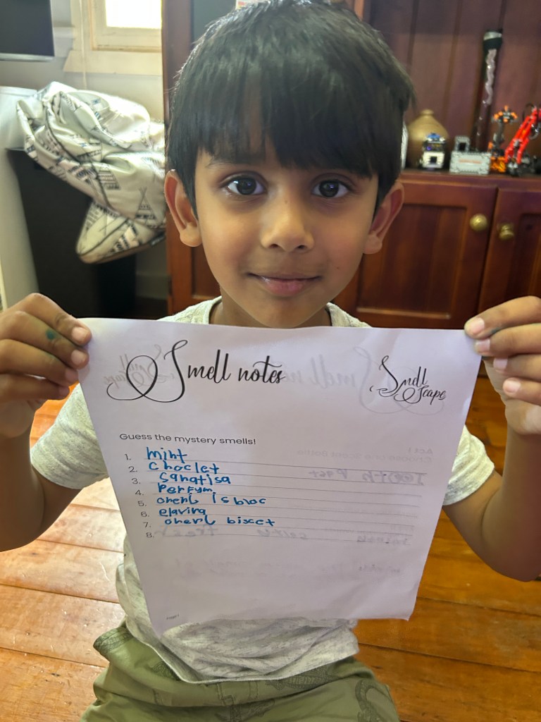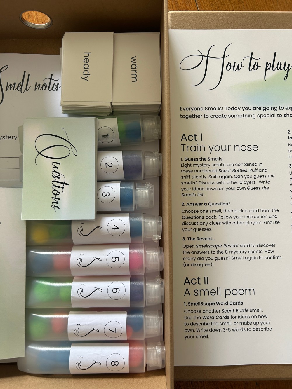 Smellscape is a vibrant tabletop game designed to lead players into the mysterious world of scent nose first. Smell, identify, discuss, share your own scent memories and create new moments together. Participants from all age groups embark on a three-part journey. They start by silently identifying a scent, then dive into collaborative conversations while expanding scent vocabulary. Finally, players weave their shared scent experiences into a collective poem. The game’s goal isn’t about winning but rather understanding and celebrating our individual and shared scent emotions and memories. A delightful experience for young learners, tabletop enthusiasts, and olfaction aficionados, underscoring the significance of scent in communication, memory and creativity.
