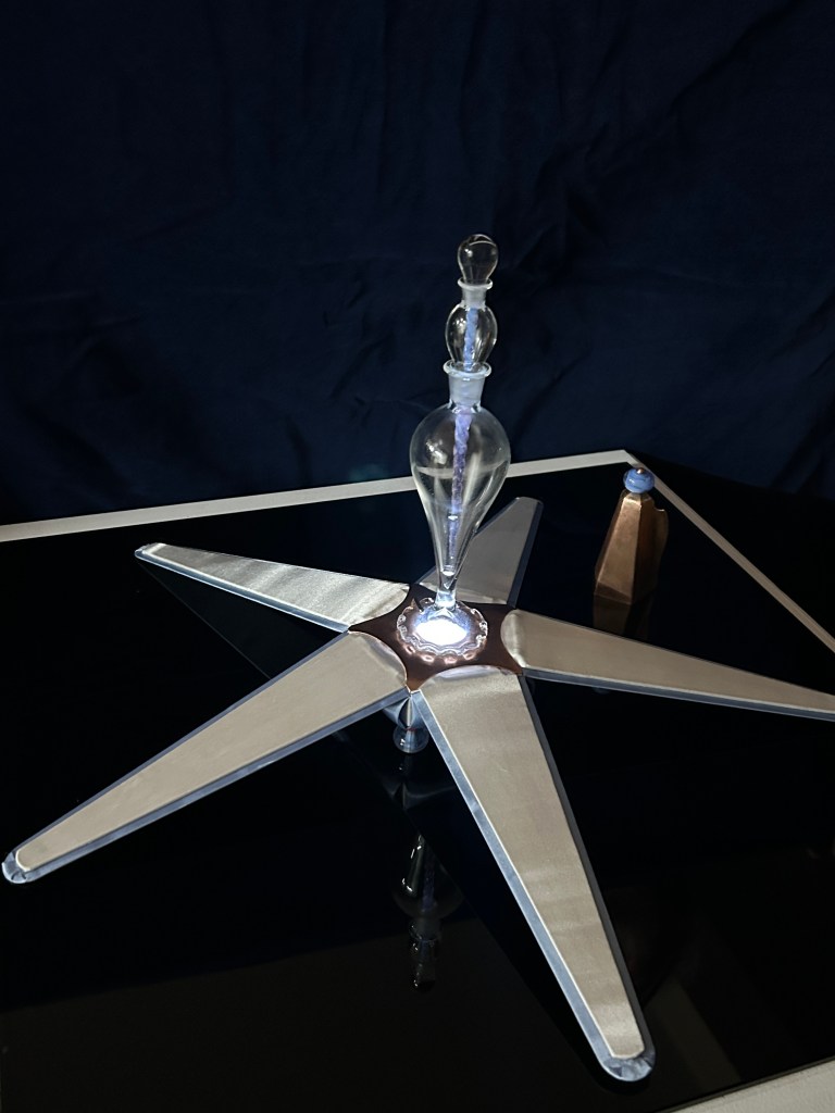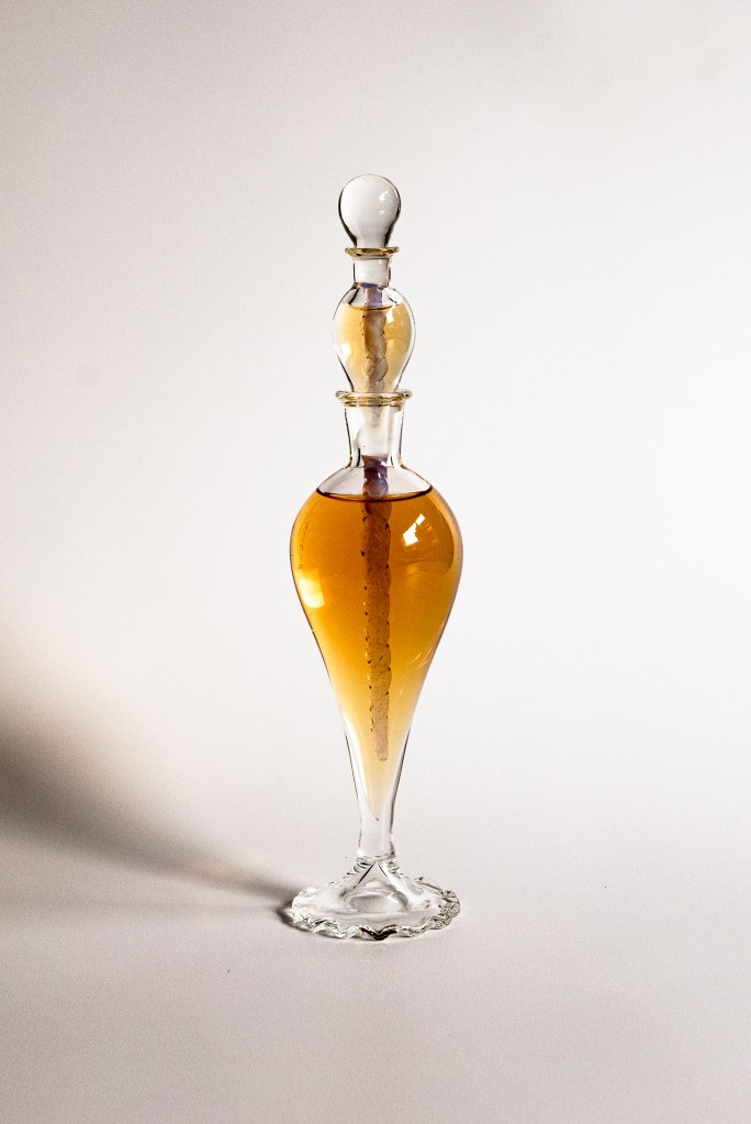 The perfume is presented in a bespoke flacon by Mark Eliott (@markeliottglass) Inside a case created by Luke Scheppers with glass bead details by Aybike Orhan Eris (@aybikeorhanglassartist).